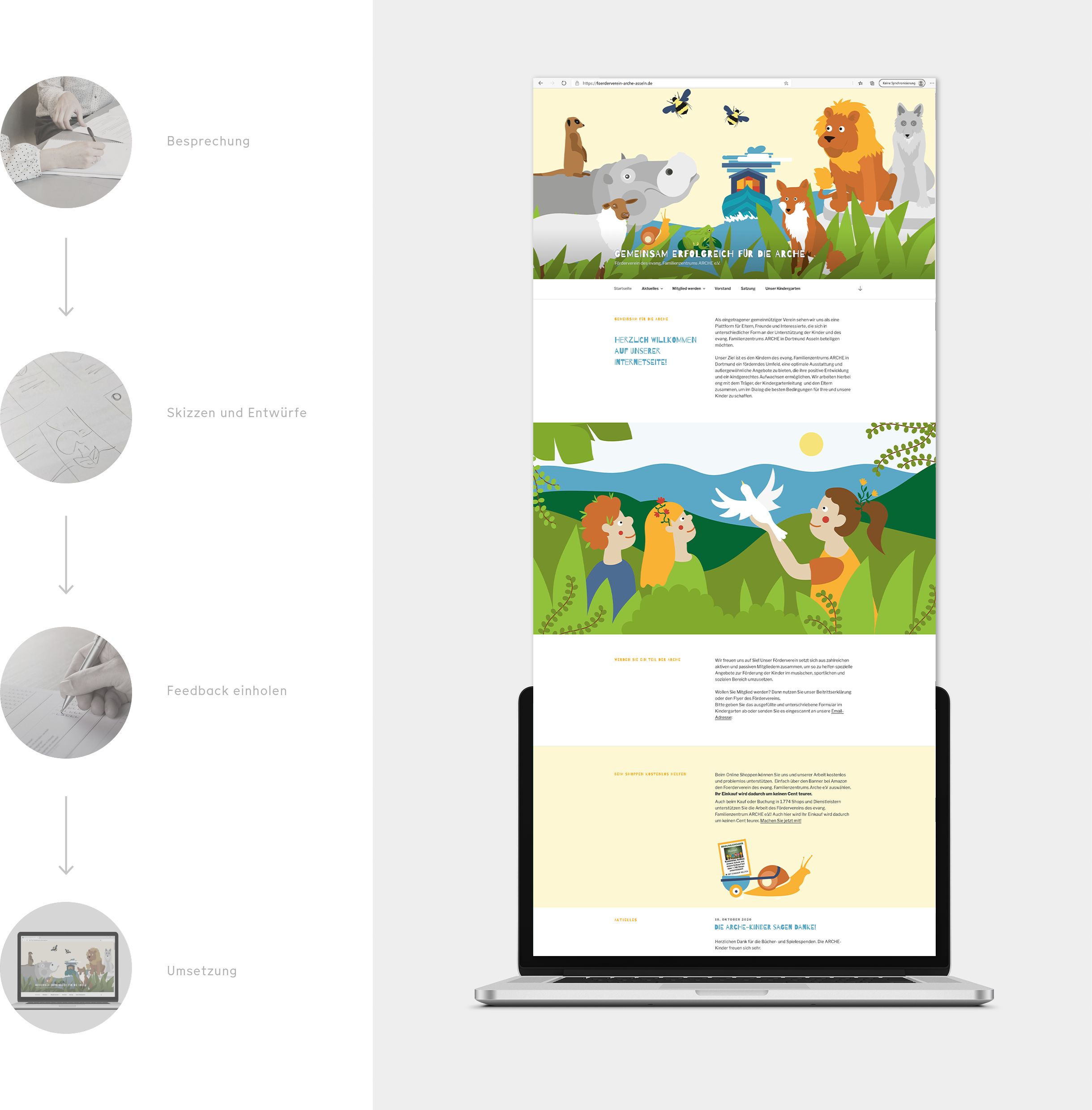 Jedes Gruppentier wurde illustrativ umgesetzt und sowohl auf der Website als auch in den Flyer des Fördervereins integriert. Der Kindergartenflyer fügt sich visuell ein, hebt sich durch den flächigen Gebrauch von Blau aber auch ab. Die bereits an der Außenwand des Kindergartens hängende Holz-Arche wurde illustrativ umgesetzt und in alle Medien integriert. Auf der übersichtlichen und verspielten Website kommen an einigen Stellen weitere Illustrationen vor.