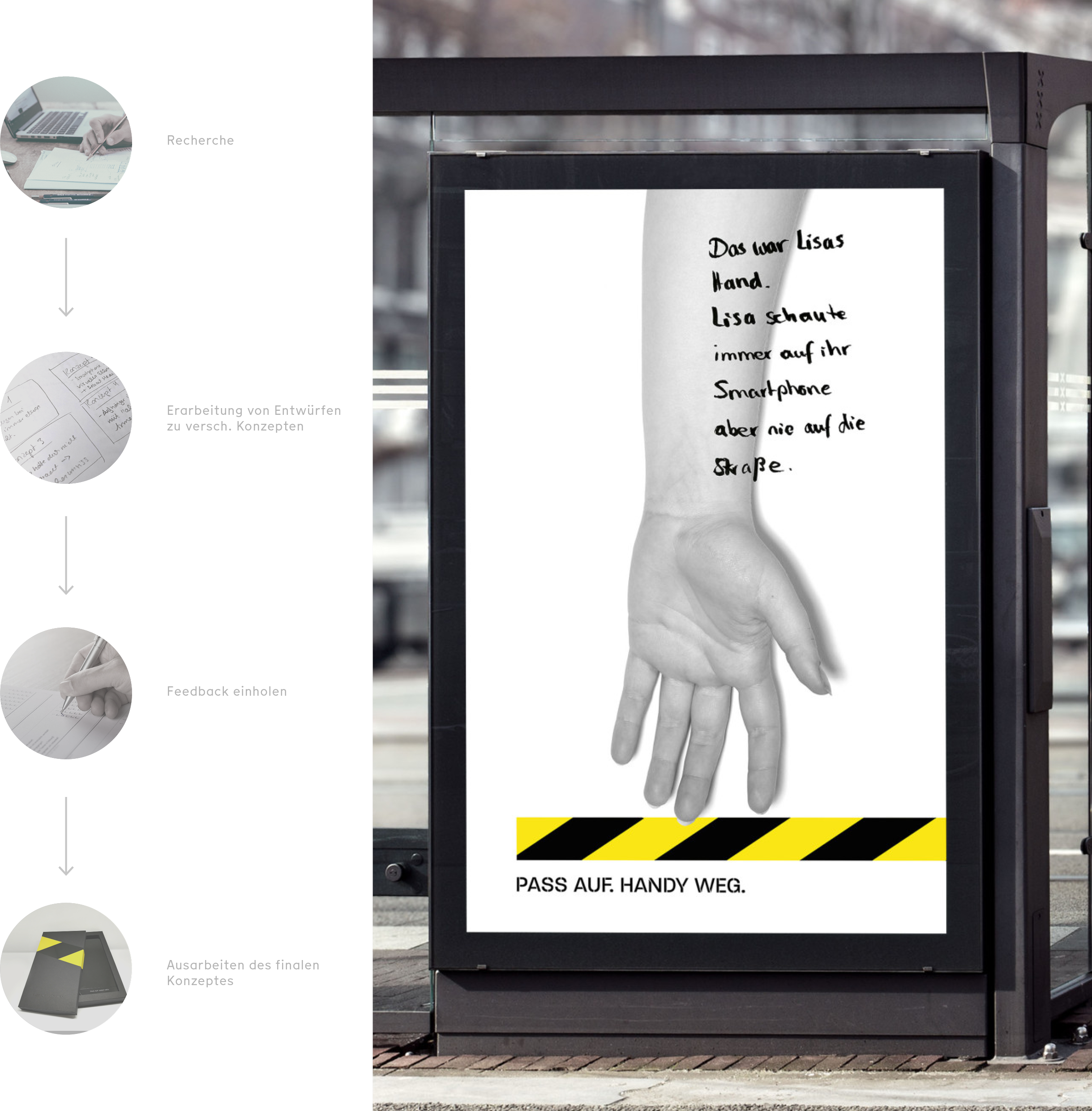 Als Erstes recherchierte ich zum Thema „das Smartphone als Gefahr im Straßenverkehr“ und schaute, welche Kampagnen es bereits dazu gibt. Darauf habe ich verschiedenen Konzepte angedacht und begonnen, als Entwürfe zu visualisieren. Nachdem ich Feedback eingeholt hatte, arbeitete ich die finale Kampagne aus.